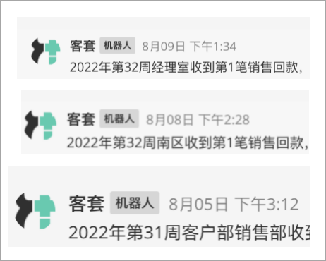 客套 CRM 系统主要是做企业名录搜索、客户关系管理的。在没有集成到 J2L3x 前,销售成单情况汇报时,往往都是由负责人登录系统整理汇总,并手动输入并发布到相关的群里的。自从与 J2L3x即时通讯集成后,可以利用机器人设置回款情况,一旦CRM 系统里有回款动作,即时通讯工具的对应频道里机器人就会发出相关的信息。