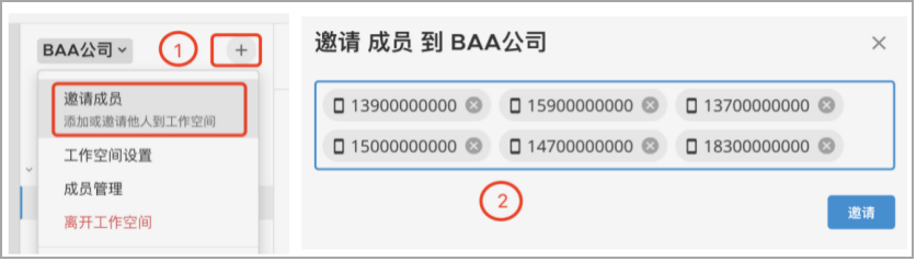 具体步骤:(1)点击“+”在下拉框,点击“邀请成员”;(2)成员的联系方式复制进去点击邀请;(3)将弹出的服务器网址和邀请码发给成员,成员注册登录即可。