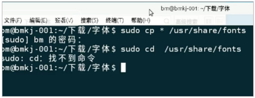 在终端中,输入命令 sudo cp * /usr/share/fonts ,并按下回车键。这条命令的作用是将当前文件夹中的所有字体文件复制到系统的字体目录 /usr/share/fonts 中。系统可能会提示您输入用户密码,这是为了验证您具有执行该操作的权限。请准确输入您的用户密码,然后按下回车键继续。