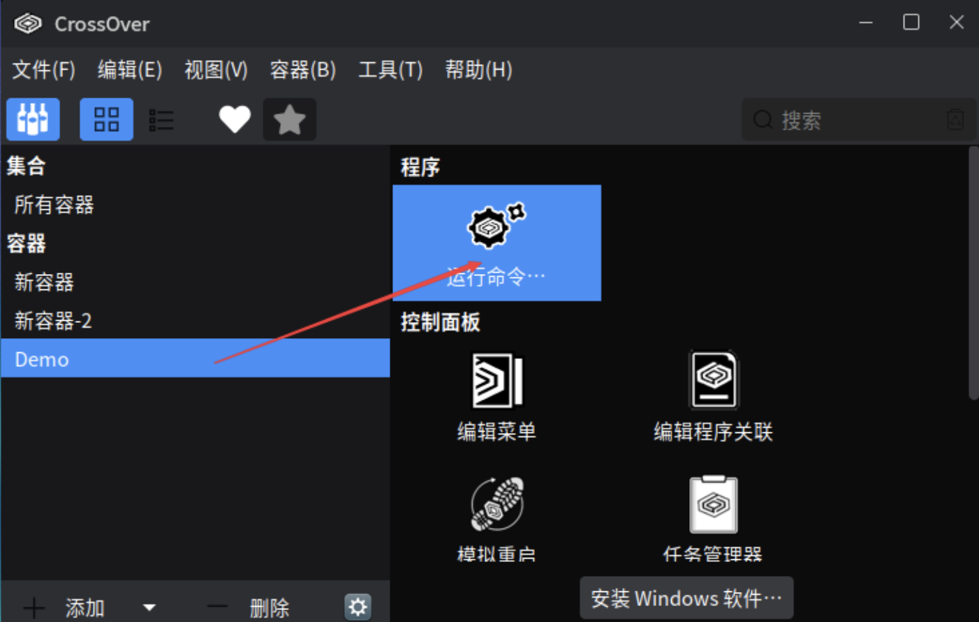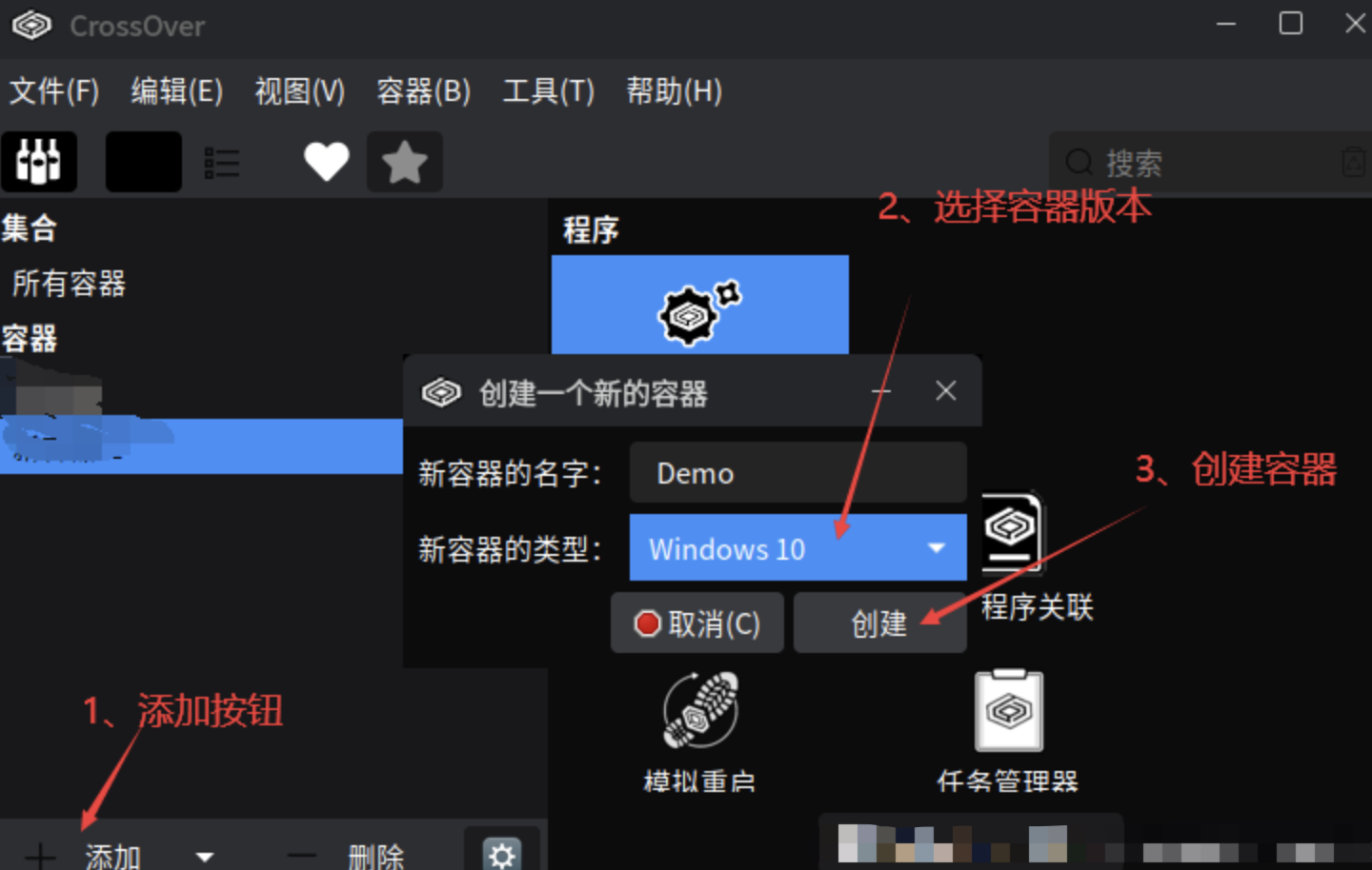 在这里,我们以创建 Windows 10 容器为例。打开 CrossOver 程序后,选择“添加 Windows 容器”,并根据提示完成容器的创建。