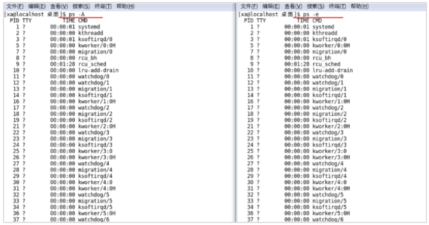 (1)ps -A / ps -e:两种命令功能完全一致,可列出系统所有进程,仅显示关键信息:进程号(PID)、运行终端(TTY)、占用 CPU 时间(TIME)和启动命令(COMMAND),适合快速概览系统进程状态。