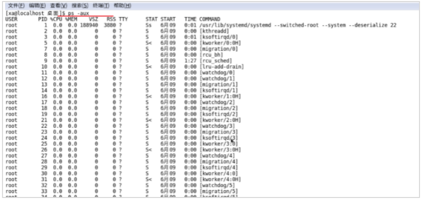 (2)ps -aux:以 BSD 格式展示完整进程信息,包含进程属主(USER)、CPU 占用率(% CPU)、内存占用率(% MEM)、虚拟内存(VSZ)、物理内存(RSS)、进程状态(STAT)等 11 项参数。其中 STAT 字段中,R 代表运行中、S 代表睡眠、D 代表短期等待,可精准判断进程状态。