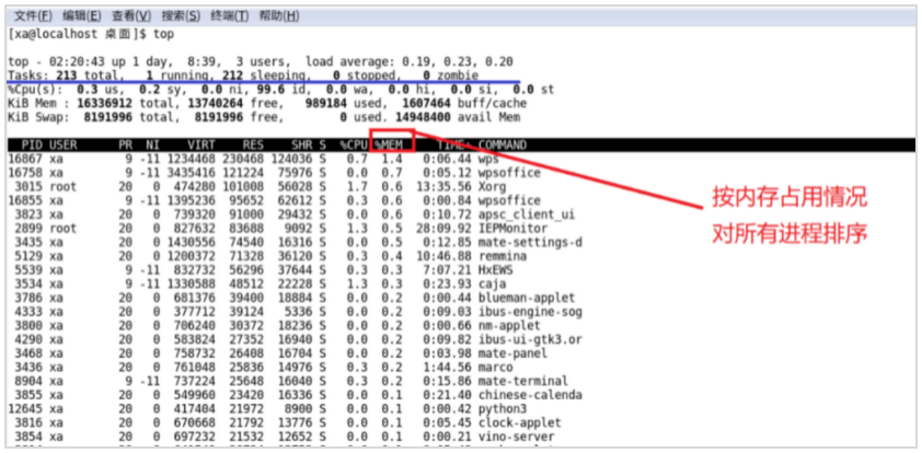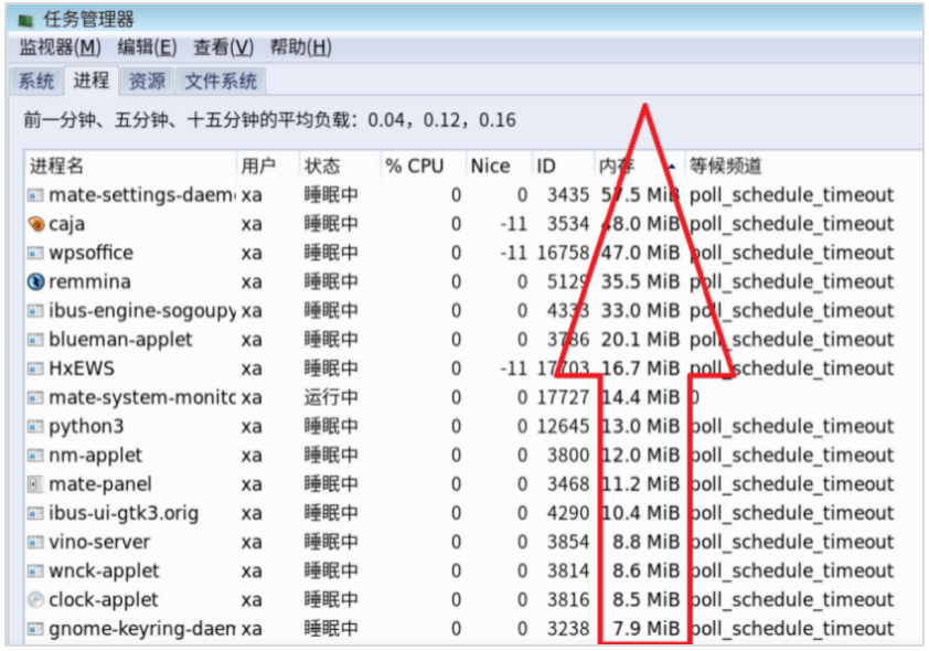 可查看所有进程的名称、用户、状态、CPU 占用率、内存占用等信息,点击表头可按对应字段排序(如点击 “内存” 按占用量排序);