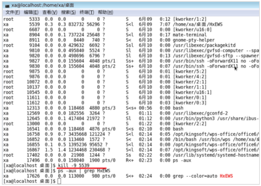 (3)ps -aux | grep xxx:针对性查询特定进程,将 “xxx” 替换为进程名或关键词,即可快速验证目标进程是否运行。例如 “ps -aux | grep HxEWS”,可查看该进程的 PID、资源占用情况及运行路径。