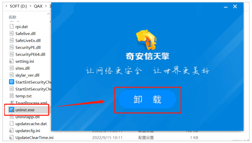 找到奇安信安装目录(我这里为 D:\QAX\360Safe)–》找到文件 uninst.exe 并双击打开,点击卸载即可。
