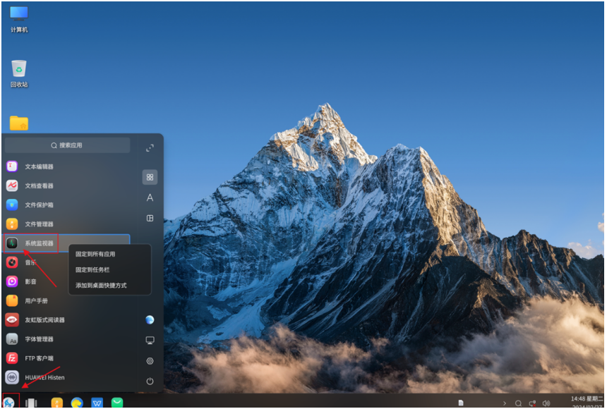 第一步,启动应用。在终端桌面左下角找到“开始菜单”,点击展开后,直接定位并选择“系统监视器”,即可快速启动该应用。该操作与华为商用终端的整体交互逻辑保持一致,符合商用用户日常操作习惯,无需额外适配学习。