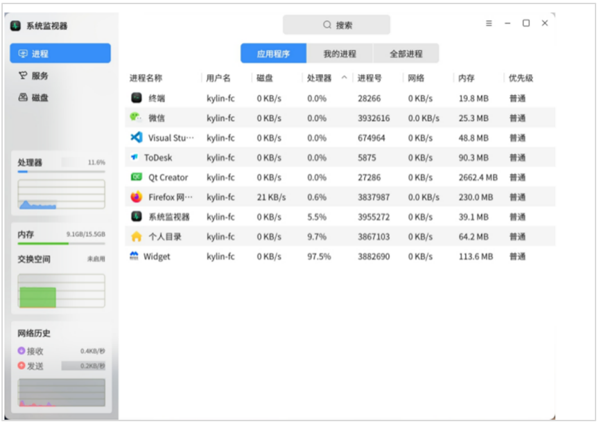 第二步,核心监控与基础管理。启动后,系统监视器将自动进入实时监控界面,可同步呈现处理器运行状态、内存占用率、网络上传下载速度等核心数据,同时支持系统进程与应用进程的全面管理。无论是快速搜索特定进程,还是针对无响应进程执行强制结束操作,均可在此一步完成,大幅提升运维效率,避免无效进程占用系统资源,保障终端运行流畅。
