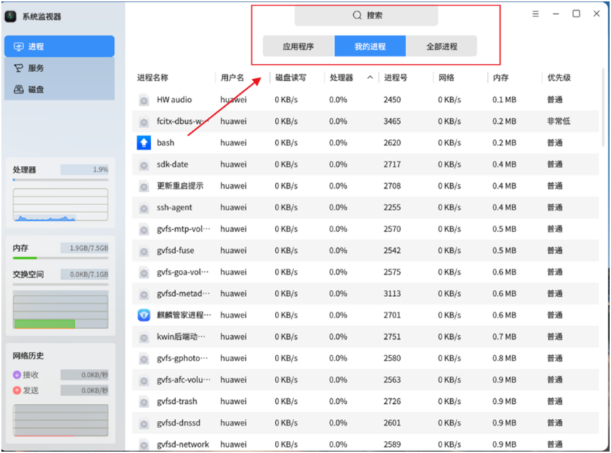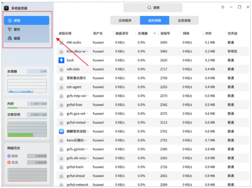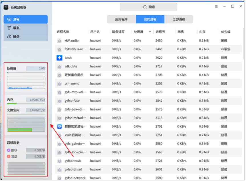 第六步,系统资源全面监测。除进程管理外,系统监视器还能实时监测处理器、内存、交换空间的占用情况,以及系统网络流量的动态变化,所有数据均直观呈现,便于用户及时发现资源占用异常、网络卡顿等问题,提前排查终端运行隐患,为华为商用终端的稳定运行提供全方位保障。