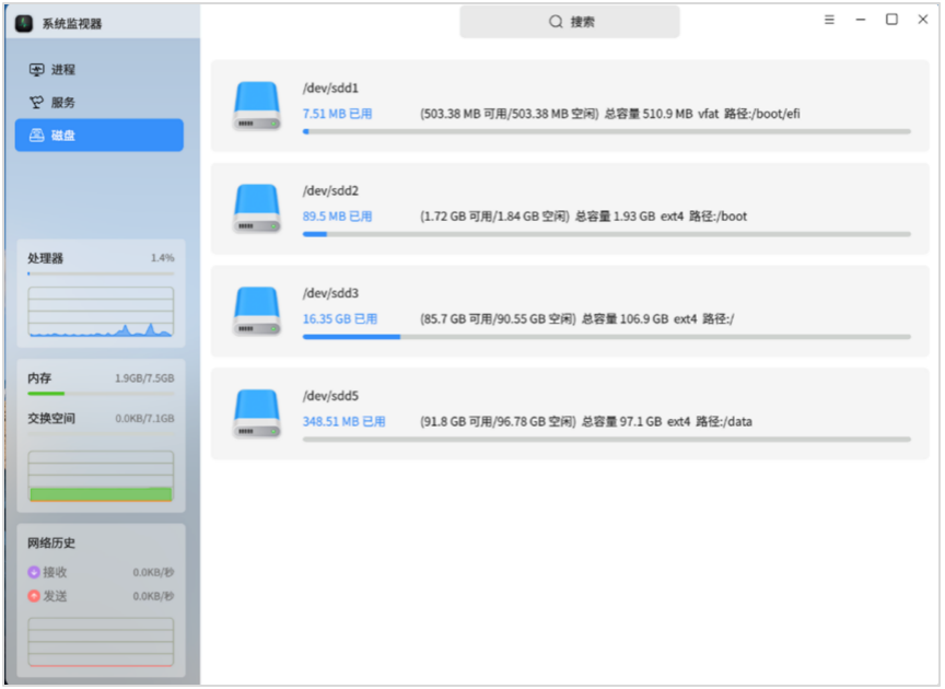 第三步,界面灵活切换。应用的侧边栏或标题栏集成了界面切换与搜索框双重功能,用户可根据实际需求,灵活切换至进程监控界面或文件系统界面,无需重复启动应用;通过搜索框输入关键词,可快速定位目标进程或文件系统相关信息,适用于多进程、多任务并行的商用场景,节省操作时间。