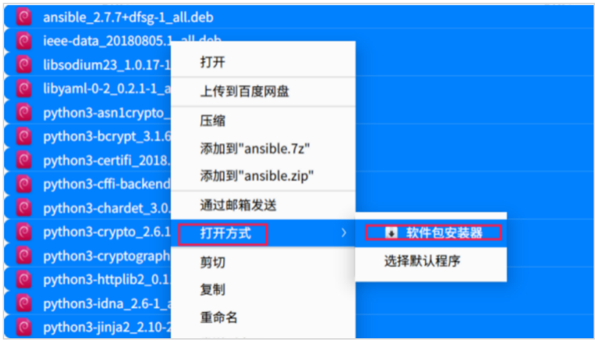 二是在图形界面选中所有 deb 文件,打开方式选择 “软件包安装器”,系统将自动处理依赖关系完成安装。