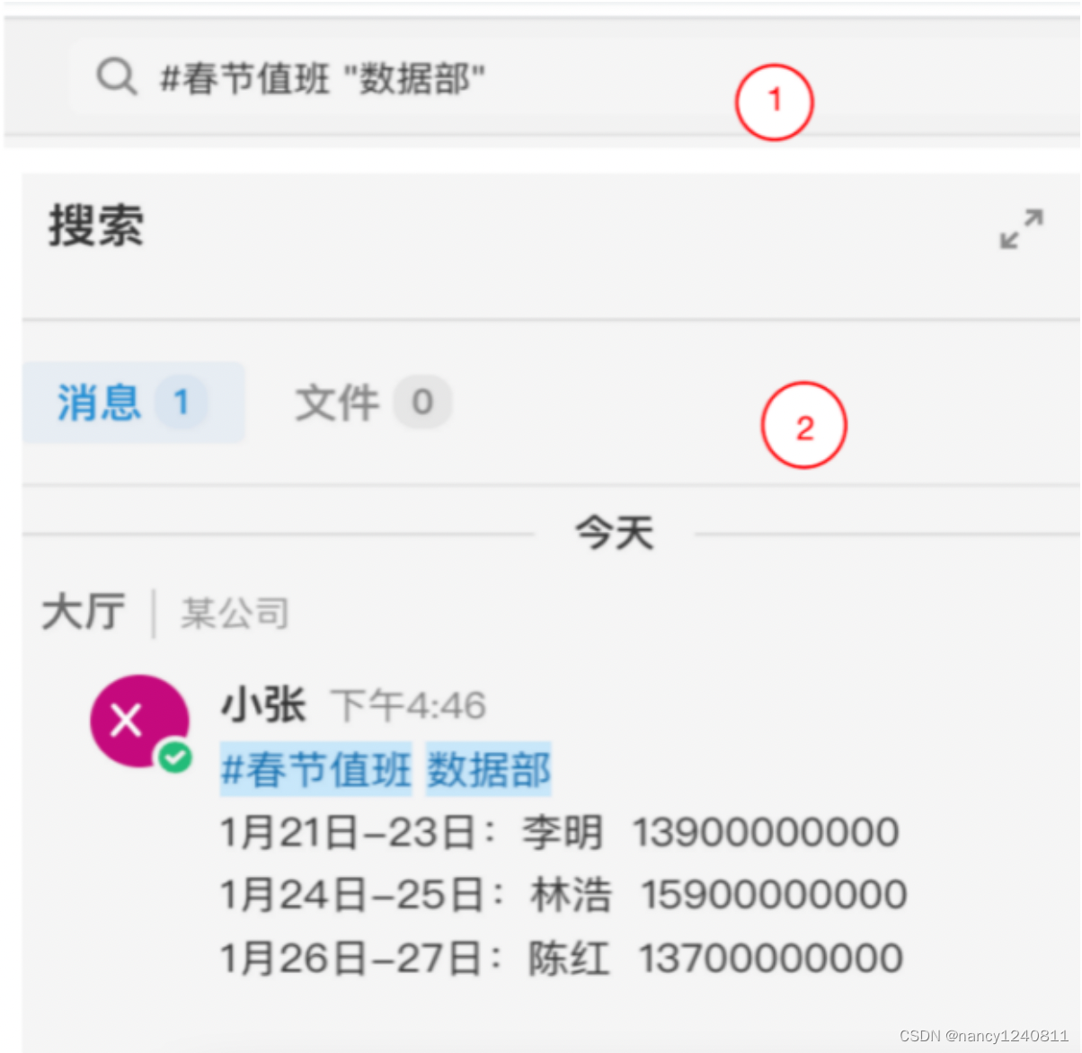 如:快速搜索对应的值班人员,可以通过 J2L3x 的搜索功能完成。在搜索框中选择消息并输入“ #春节值班 “数据部” ”,即可在右侧展示该部门的值班人员相关信息。