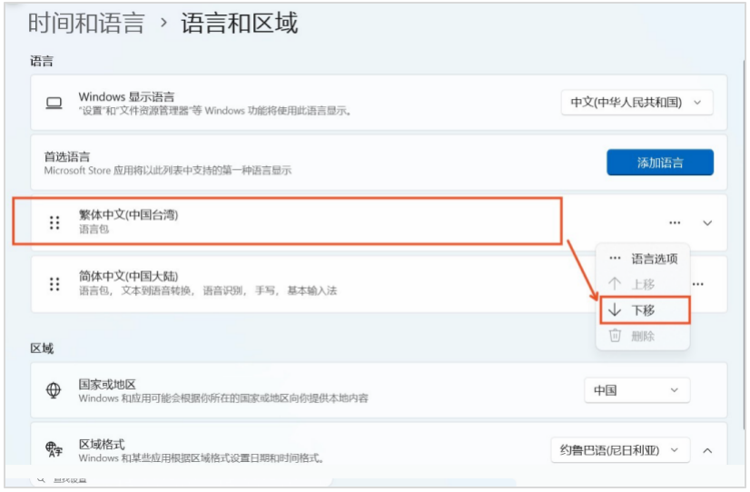 在“首选语言”部分,确保“中文(简体)”被设置为默认语言。如果不是,请点击“添加语言”并选择“中文(简体)”。