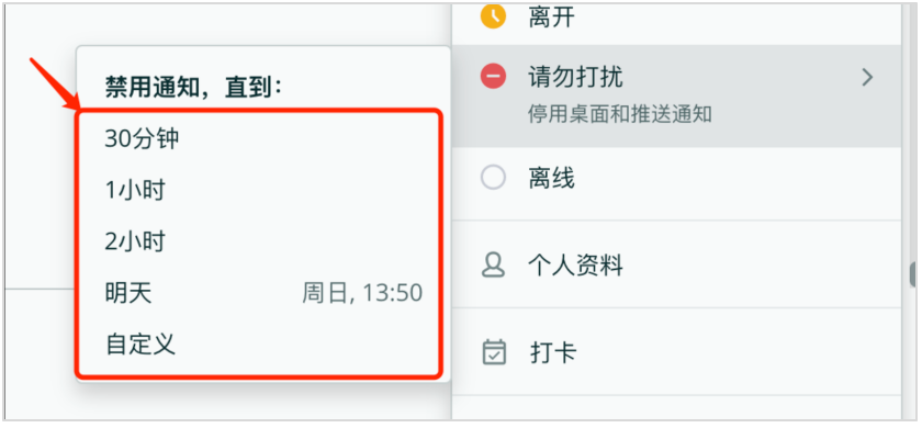 如果你选择了“请勿打扰”状态,可以进一步设置该状态的结束时间。这可以通过点击“请勿打扰”旁边的“>”按钮来完成。在弹出的菜单中,你可以选择“30分钟”、“1小时”、“2小时”、“明天”或“自定义”时间。设置结束时间可以帮助你在任务完成后自动恢复到其他状态,避免错过重要通知。