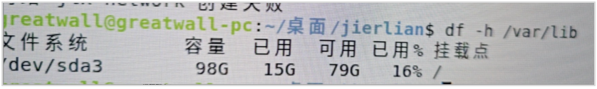 该命令中,“df” 是用于查看文件系统磁盘空间使用情况的核心指令,“-h” 参数表示以人类可读的格式(如 KB、MB、GB)显示存储空间数值,避免了原始字节数的繁琐解读,而 “/var/lib” 则指定了需要查询的具体目录路径。